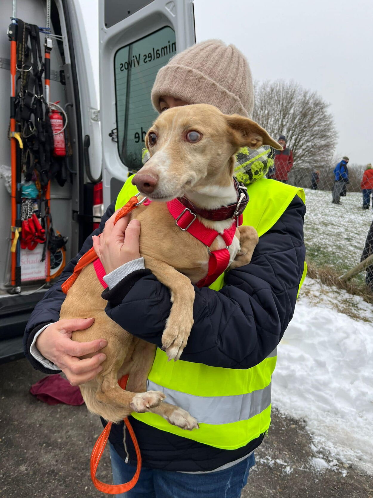 Aiaiai, kalt war es heute. Um nicht zu sagen sehr kalt. Aber die Kälte tat der guten Laune von Adoptanden, Pflegestellen und Helfern keinen Abbruch. Denn da kamen sie ja angerauscht, unsere (nun ehemaligen) Schützlinge. Trotz gewissen Widrigkeiten in Strassenverkehr pünktlich ( grosses Dankeschön an Dogs on Road!).
